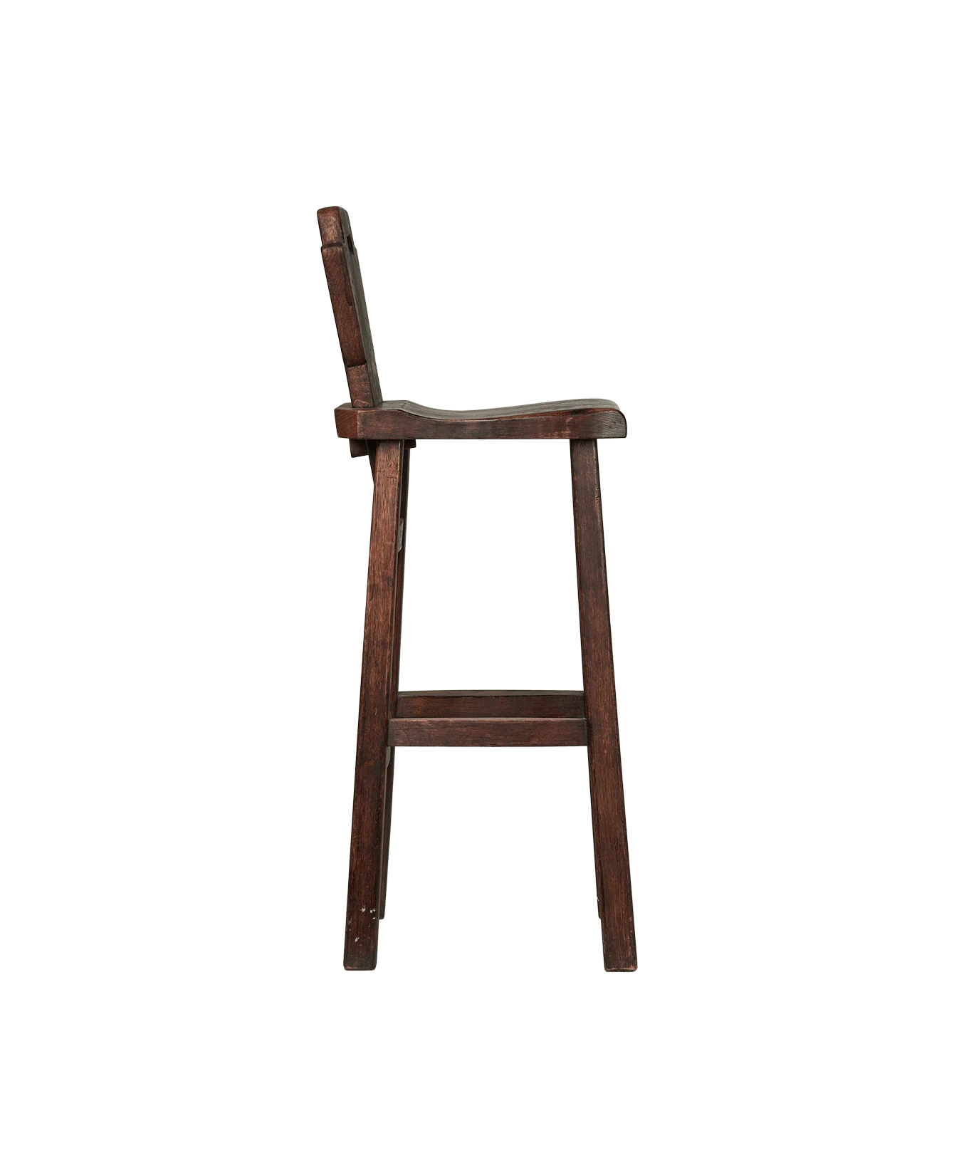 Originally used in Danish taverns and homes, this Vintage Bar Stool showcases mid-20th-century Scandinavian design. Crafted from rich, dark wood, its sturdy structure features a high back and rounded edged seat, embodying functional sophistication. Style this object as bar stool seating or as a hero object in a corner, adding a touch of timeless elegance and versatility to any space.