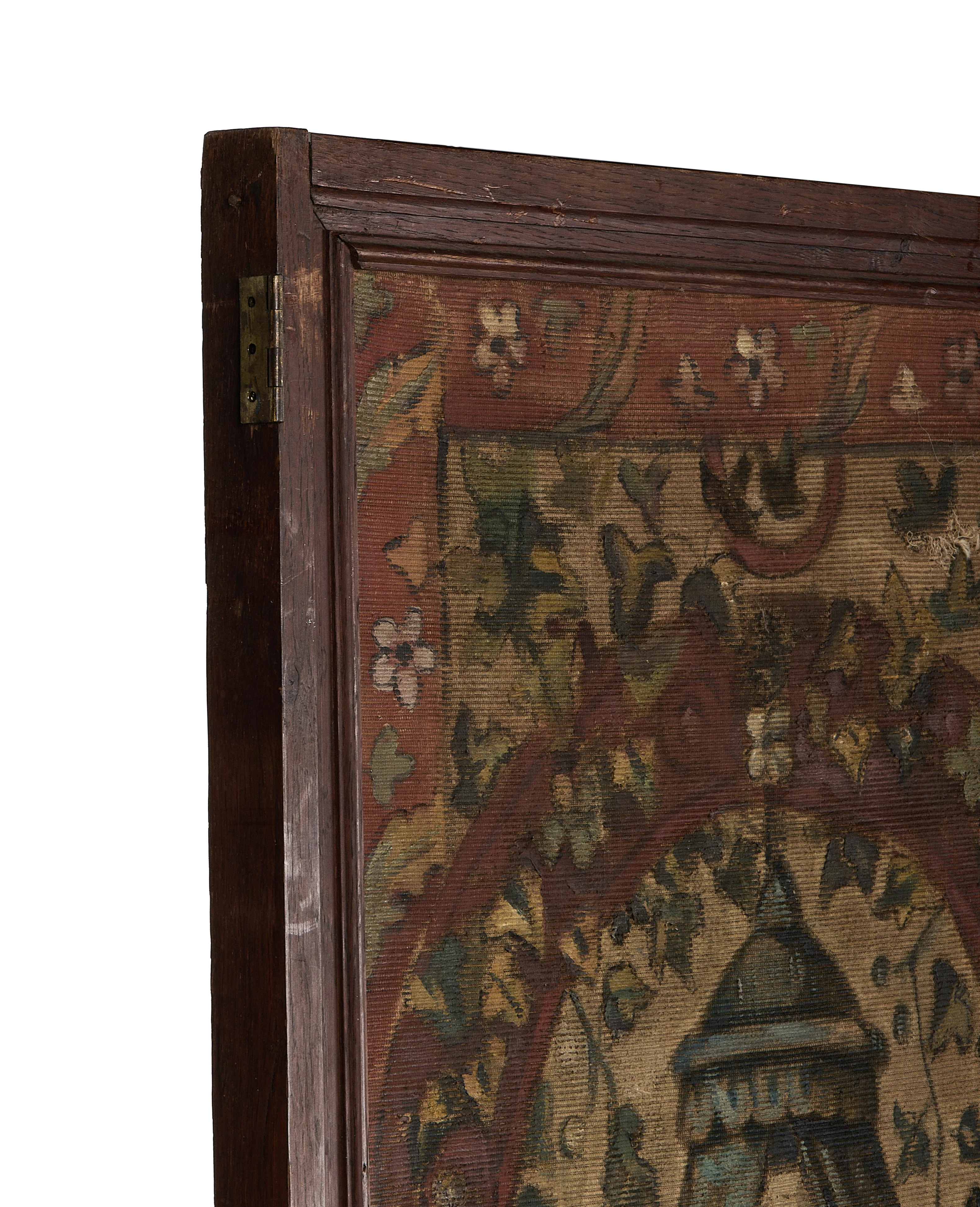 The textile's fine weave and subtle color variations speak to the hand-finished craft of its creation. It is presented within a robust, dark wood frame that beautifully complements the tapestry's aged character and provides a ready means for display.