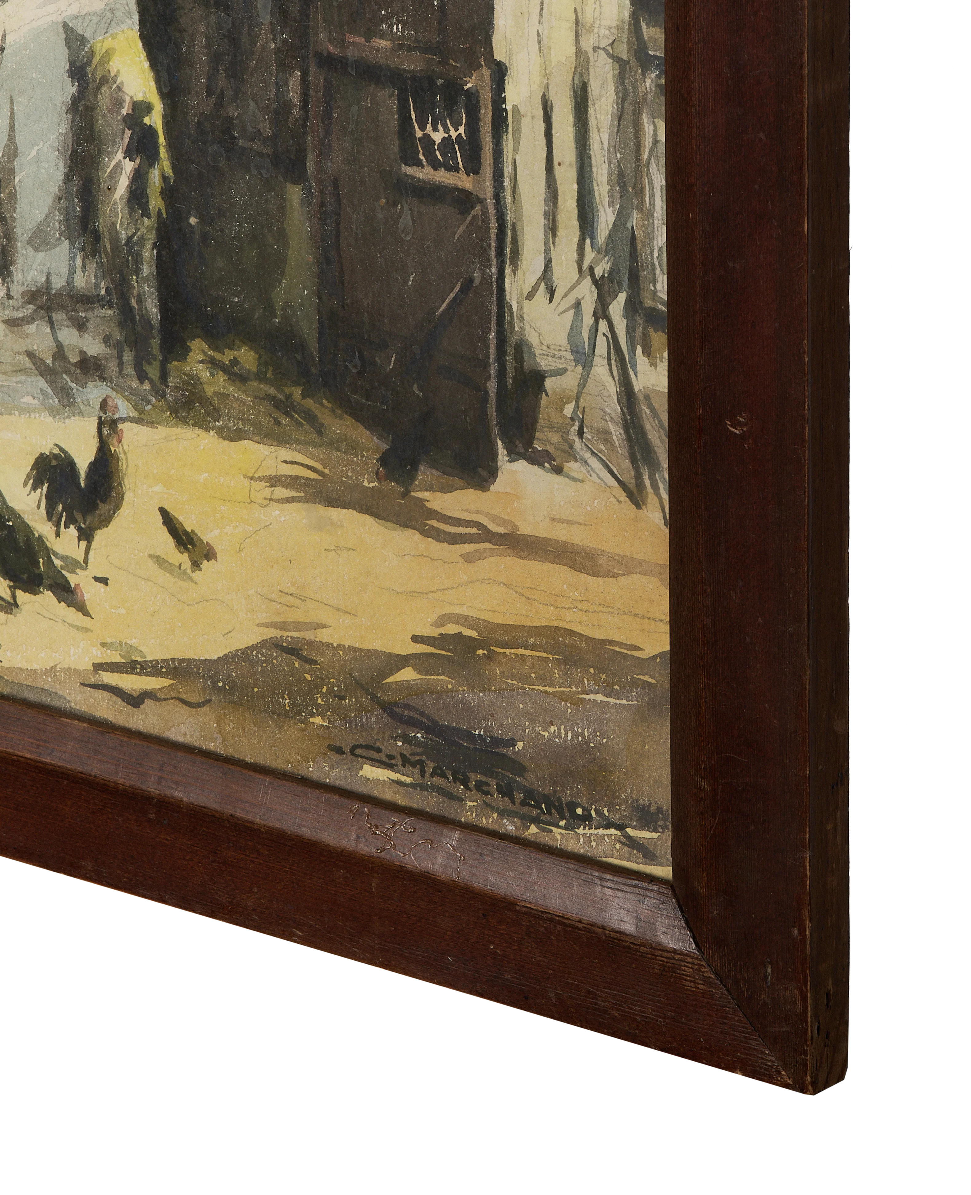 Object is exactly as shown. This original watercolor, sourced from the French countryside, quietly depicts a rustic scene. A charming thatched-roof cottage, nestled among soft foliage, takes center stage, while a figure stands nearby, adding a subtle sense of habitation. The artist's confident brushwork and muted palette evoke the serene rhythm of old-world country life.