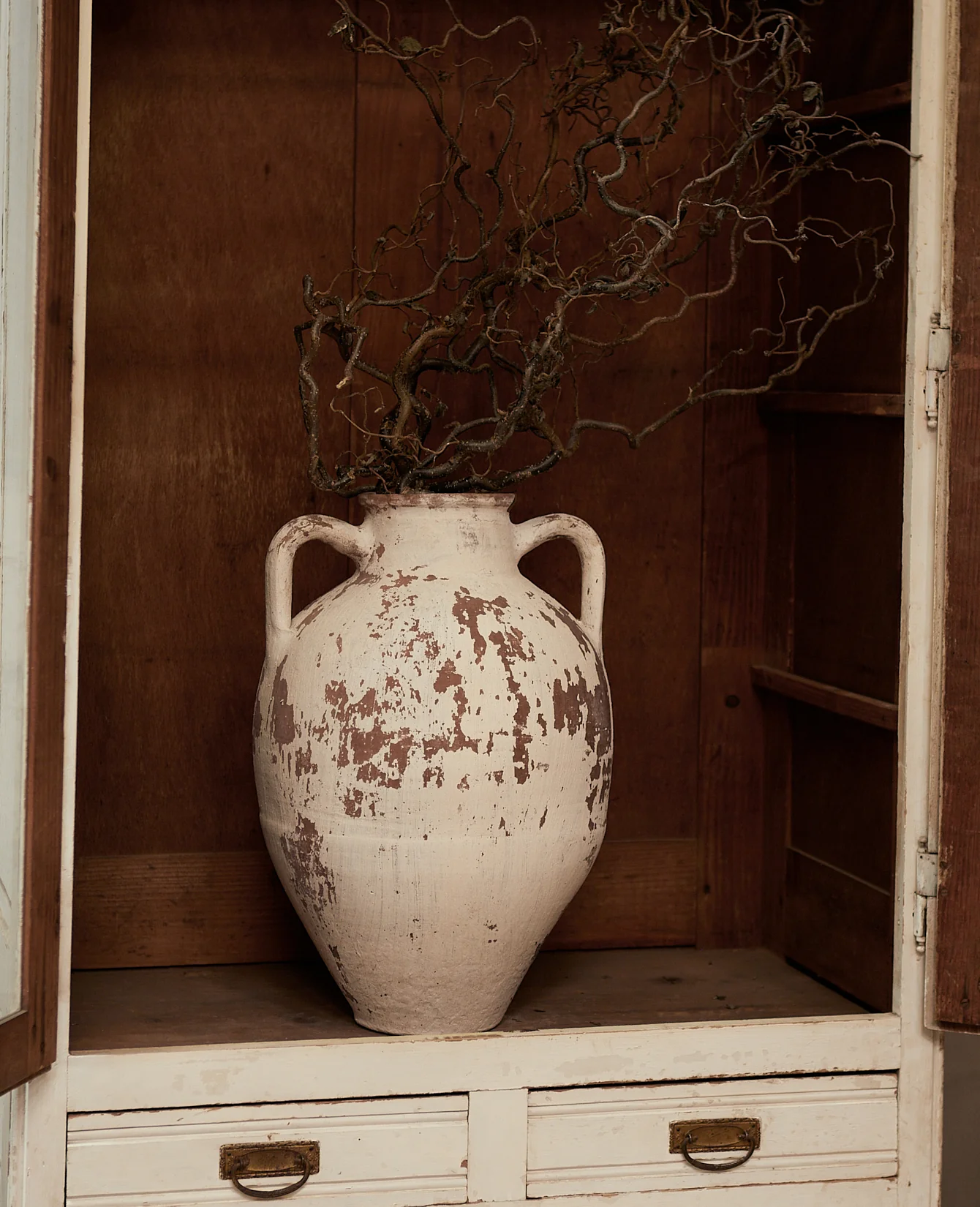 Originally used to store oils, water, and other liquids or foods, this object is not modernly water safe and should be used with a separate, internal water vase or dried branches.