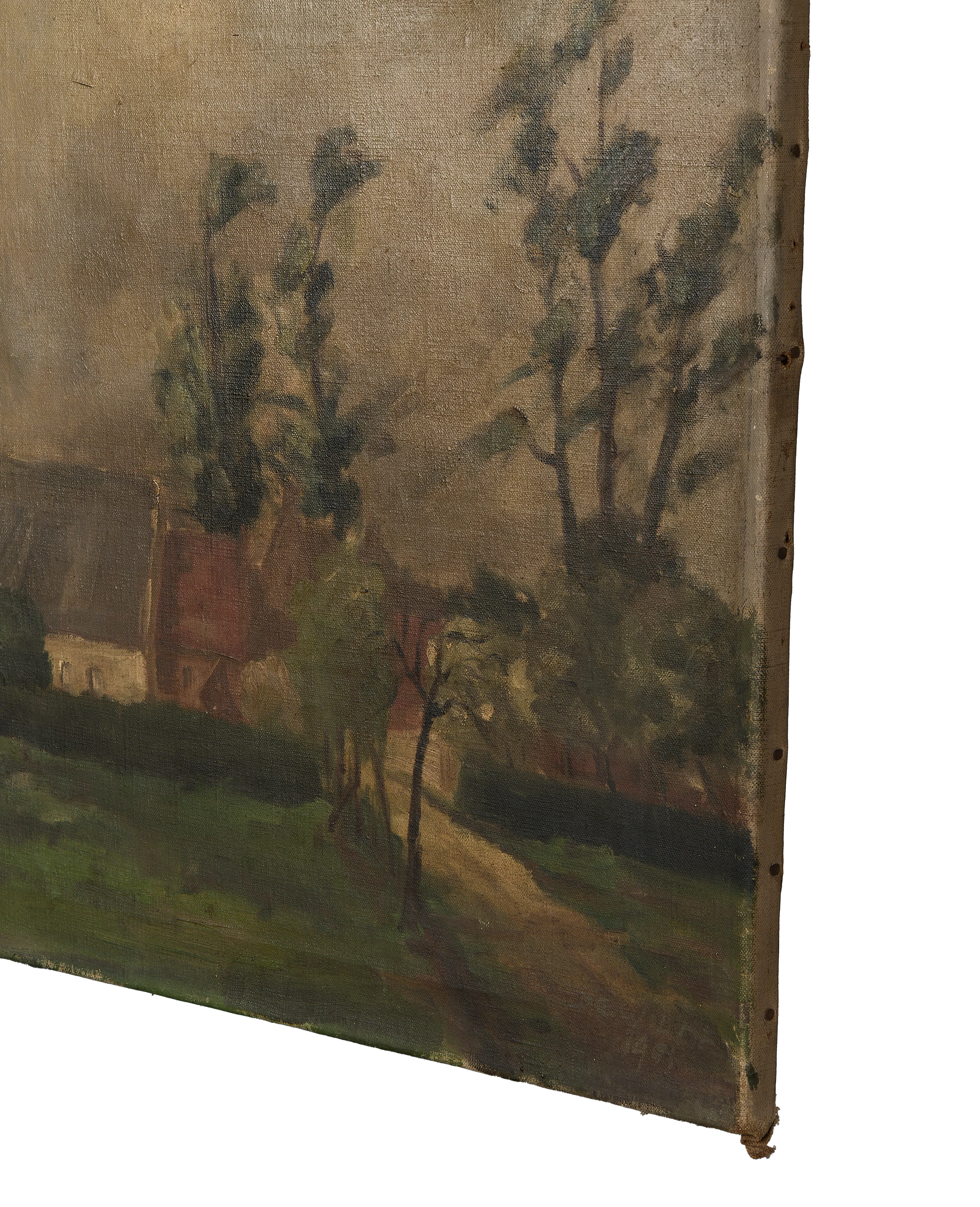 Object is exactly as shown. This oil on canvas offers a quietly observed scene, likely from the French countryside. A church spire rises above modest village roofs and verdant fields, rendered in broad, soft strokes and a hushed palette that evokes the passage of time and an old-world charm.