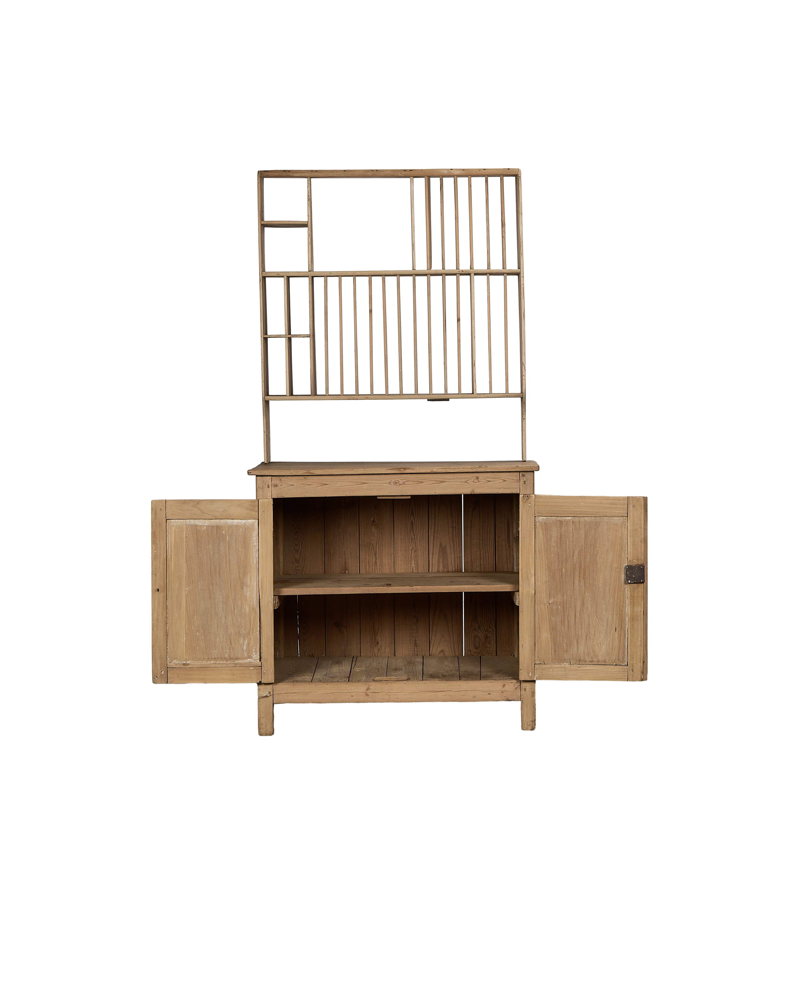 Object is exactly as shown. This splendid pine wood postal cabinet, discovered in France, speaks to a heritage of meticulous organization and enduring craft. Its raw, untreated wooden surfaces and exposed joinery suggest a life of quiet utility, while the open, spindle-backed upper shelving offers a soft display for curios or collected books. The sturdy base cabinet provides generous, hidden storage within its two-door compartment, revealing internal shelving that has served countless purposes over time.