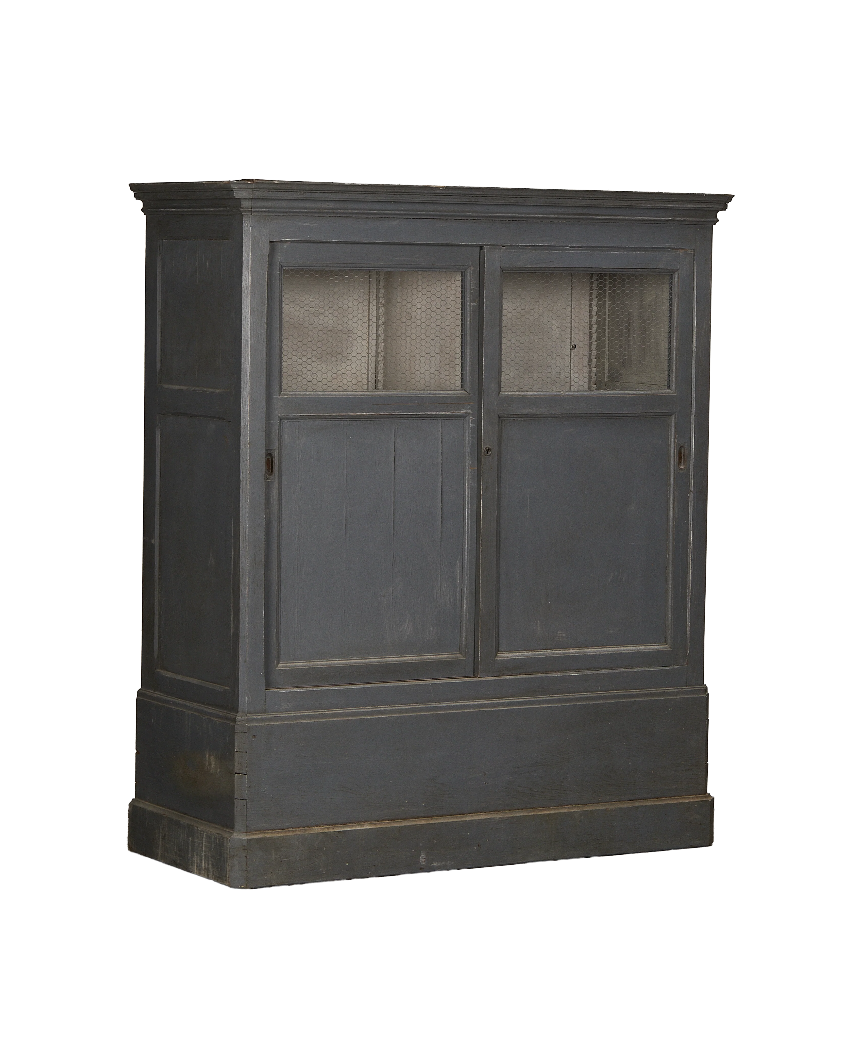 Object is exactly as shown. This grand painted wood cabinet, sourced from France, offers a substantial presence with its deep charcoal finish and quietly detailed cornices. The sliding doors, a nod to practical old-world design, feature hexagonal chicken wire over glass in their upper panels, adding texture and an inviting glimpse of what lies within.